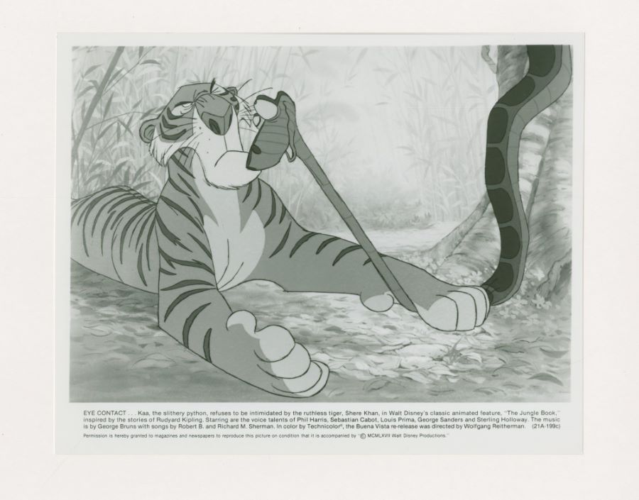A collection of press releases and promotional photographs from a 1980s re-release of the Disney Studios animated classic "The Jungle Book," originally released in 1967. The 11-page press release details a cast and crew list, production information on the author, music, animators, international awards, and the director. Included with the press release are two black and white promotional photographs featuring Bagheera, Baloo, Kaa, and Shere Khan. The 11"x8.5" press release and 10"x8" photographs are in very good condition with handling-related edge and corner wear, particularly tearing to the top left corner, age-related paper discoloration, and graphite marks to the front of the press release.